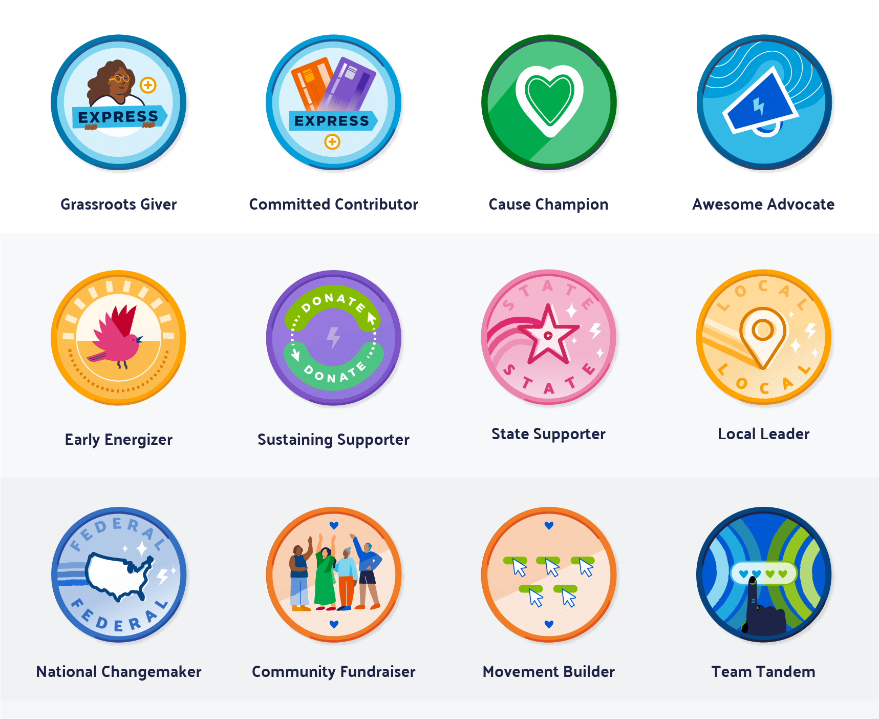 • Donor badges allow you to celebrate your achievements as an ActBlue Express user! ActBlue Express users earn badges when they take different actions or reach organizing milestones. Log into your ActBlue Express account to view the badges you’ve earned as well as the badges you have yet to earn. There are currently twelve donor badges you can earn through your ActBlue Express account by giving to a local candidate, making a recurring contribution, and more! And don’t forget to share your new badges on social media with your friends and family!