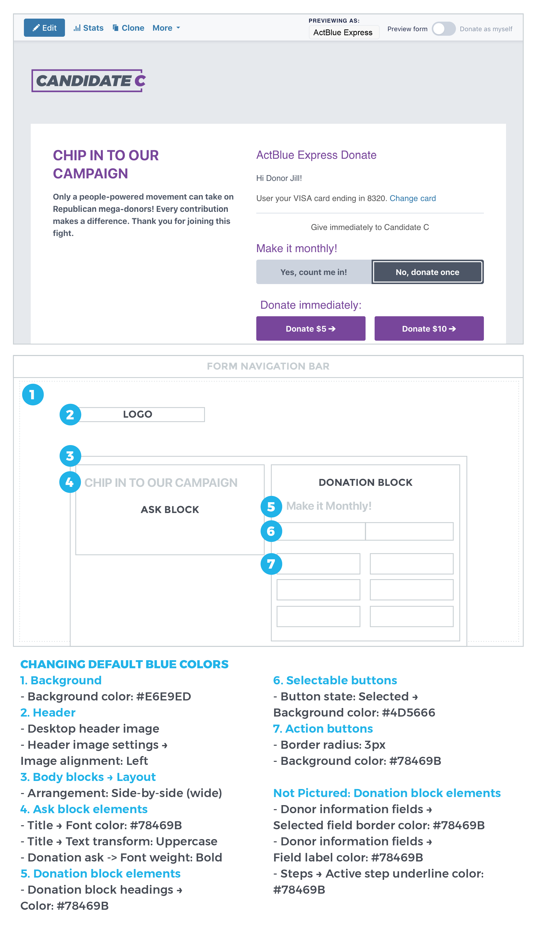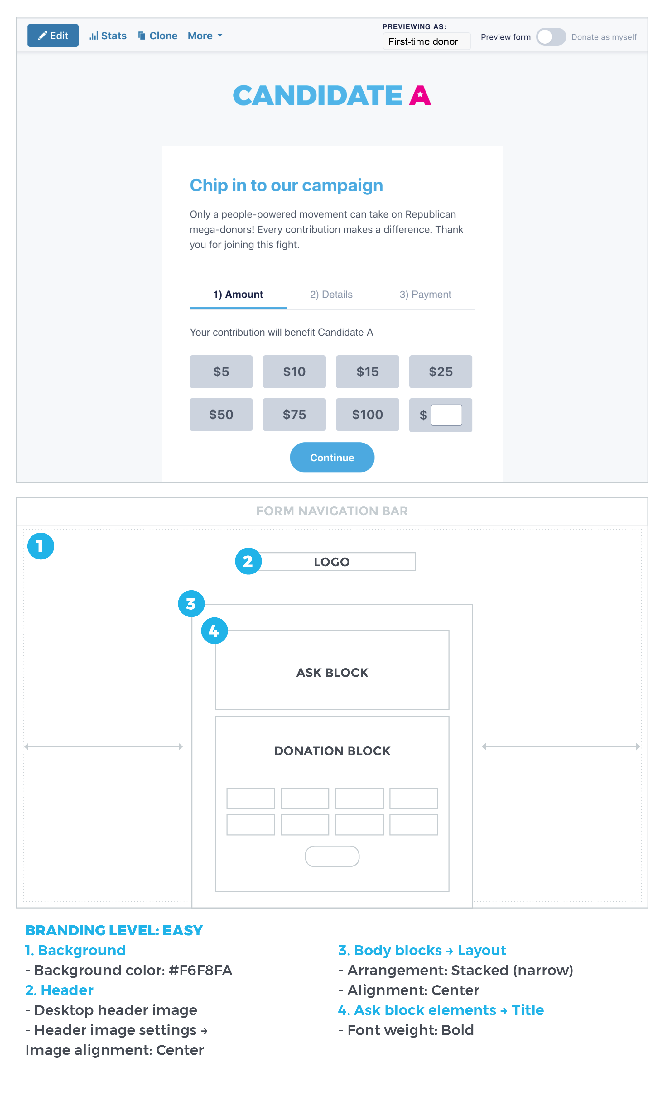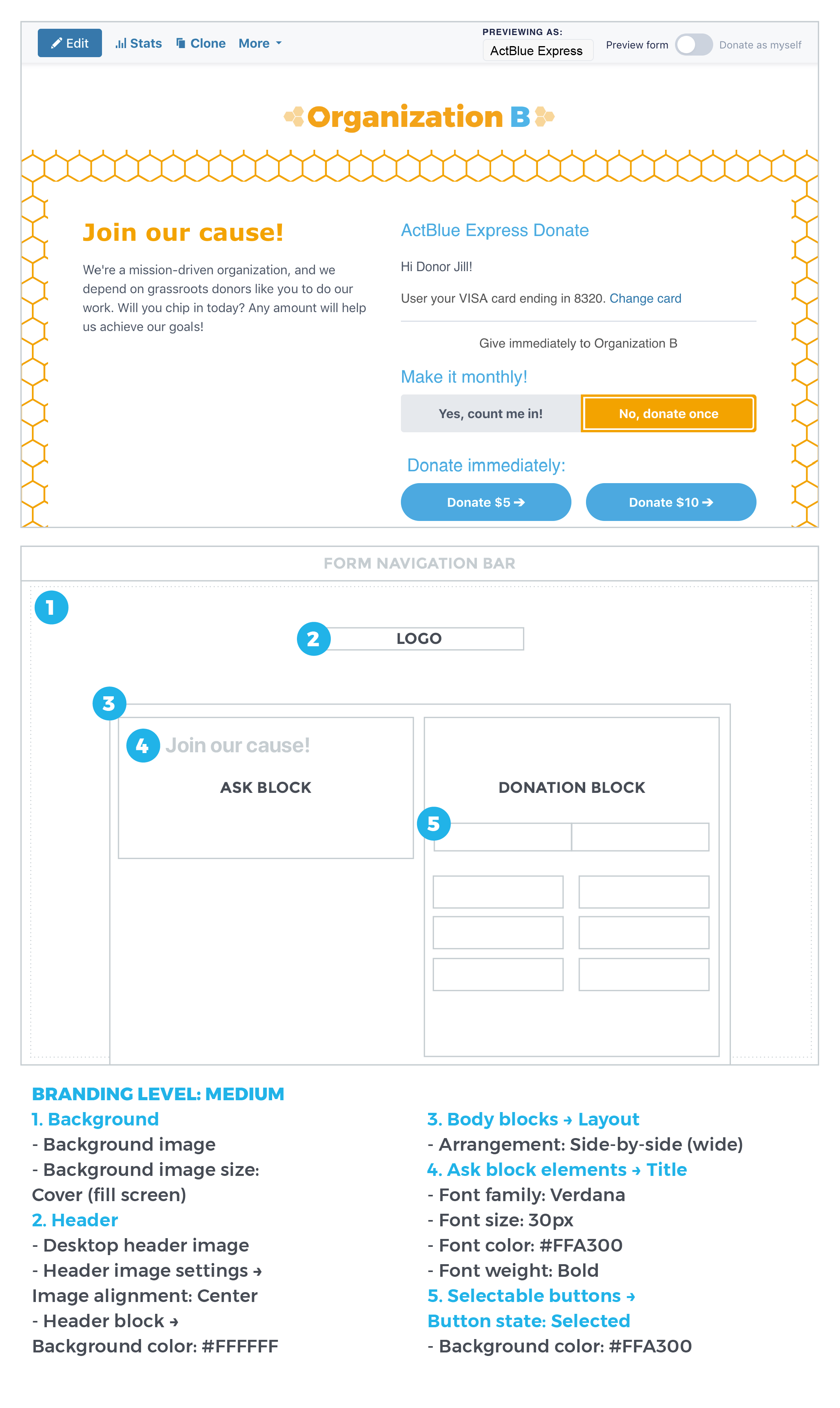 You may have heard: We completely upgraded how brandings are created and edited on ActBlue! No matter your digital skills or design background, you can make gorgeous brandings right in the form editor. But with far more creative freedom and customization options comes far more power. You may need some time to get familiar with every corner of our new and improved branding editor, so we’ve compiled digestible design tips to help you get your footing and tackle form brandings with confidence.