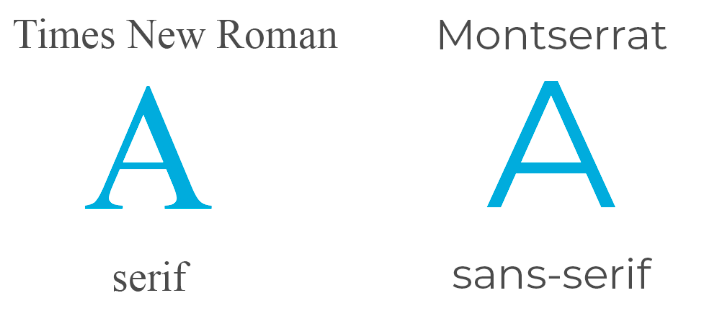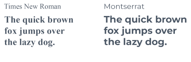 Serif fonts like Times New Roman seem traditional and bookish, while sans-serif fonts like Montserrat appear modern and informal.